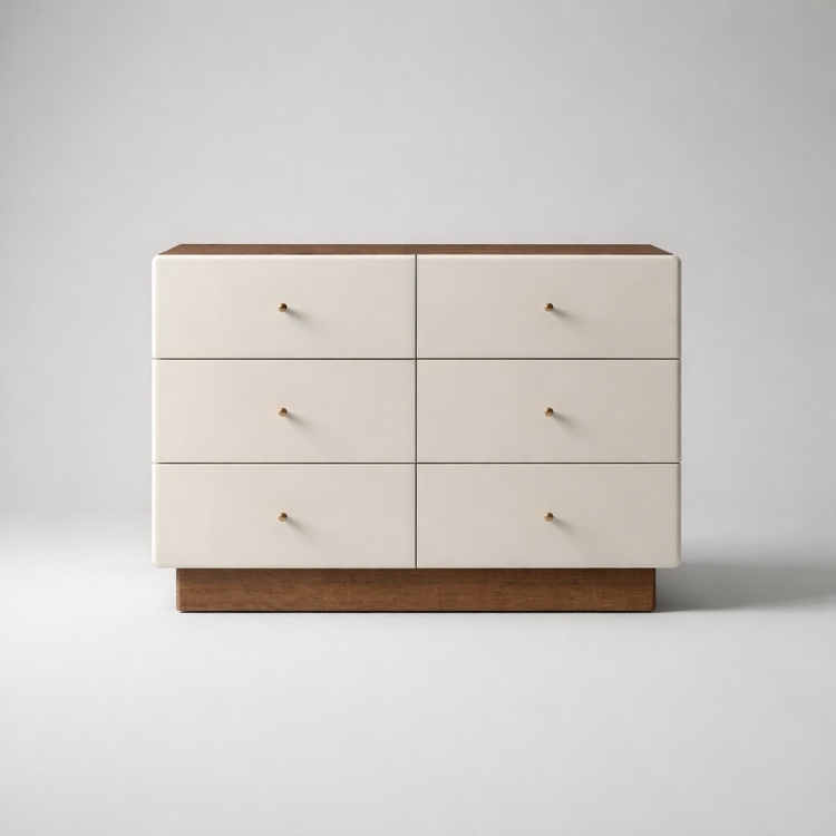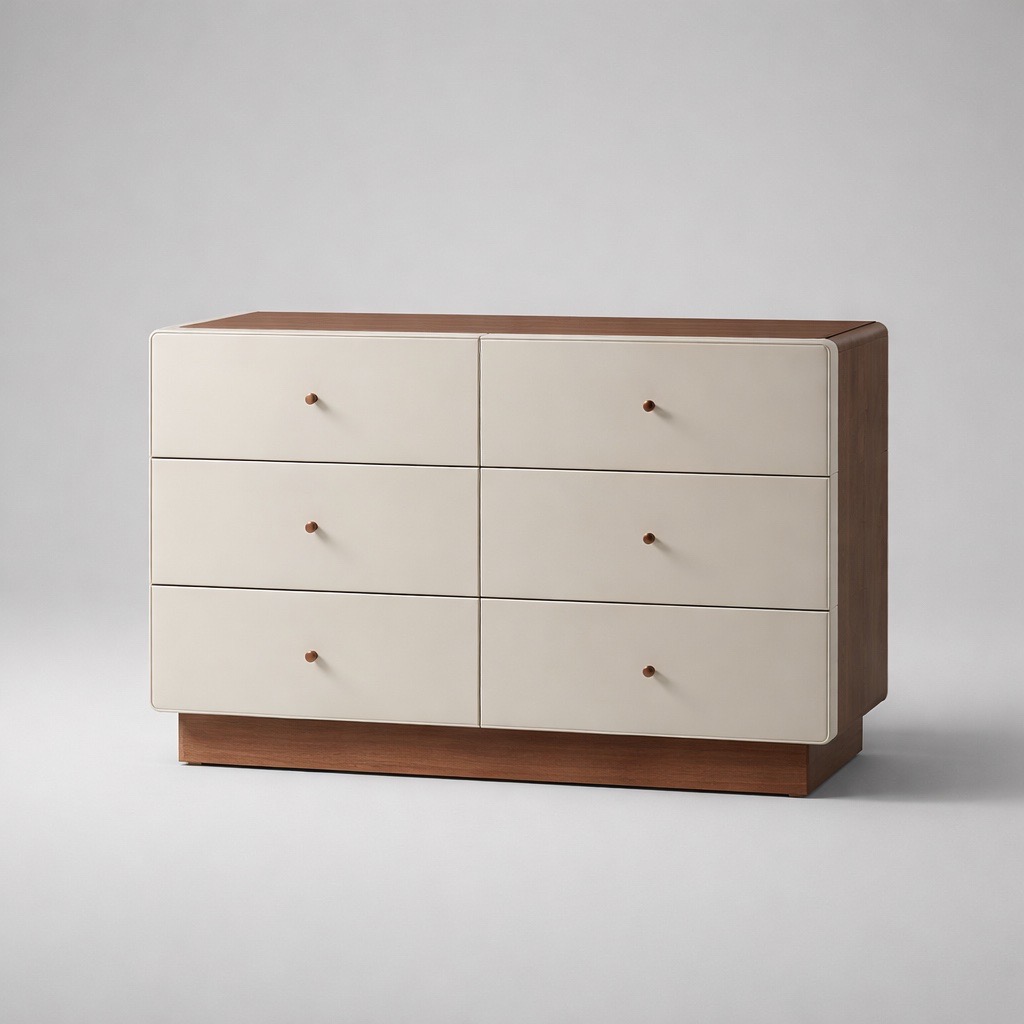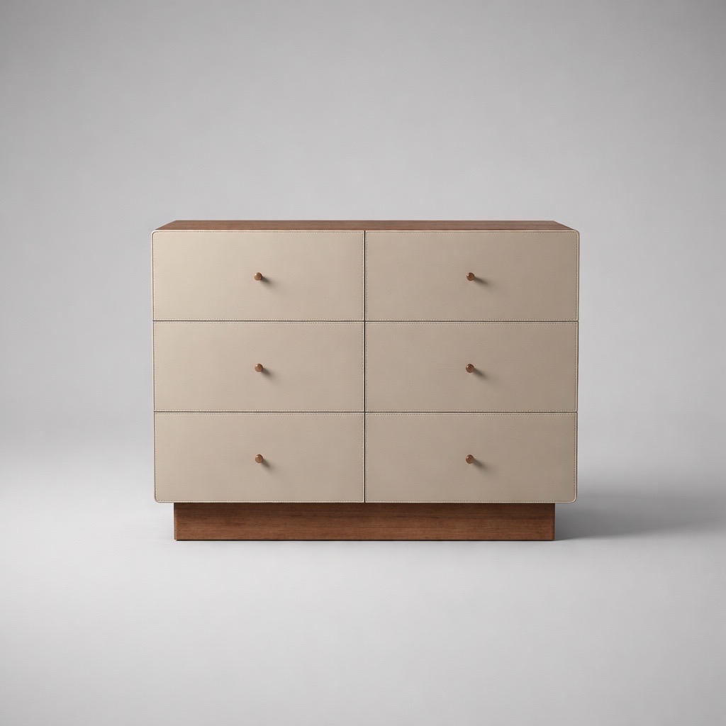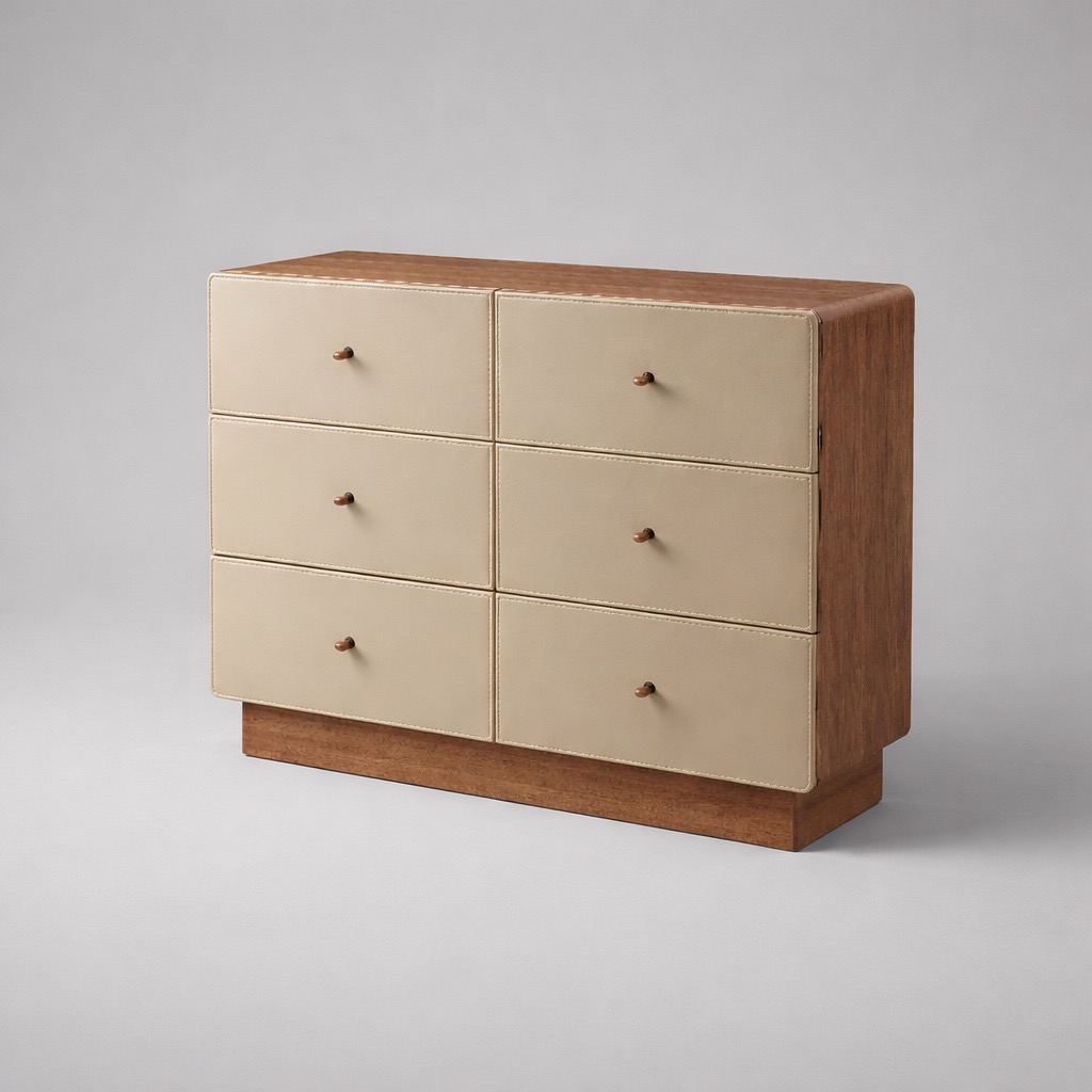 קומודה מפורניר אגוז עם מגירות בגימור דמוי עור קשיח, בעיצוב נקי ואלגנטי. מתאימה לחדר שינה ולשילוב בכל חלל בבית.